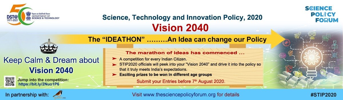 Albert Einstein once said “The greatest scientists are artists as well”. With a view to seek inputs in creative ways towards the formulation of the STIP 2020, we are happy to announce an Ideathon. The Ideathon is a competition where participants are encouraged to share any concept or ideas related to their views about the STI ecosystem and what/how the policy should be addressing it. This can be in any creative form of expression- text, visual (graphic / images / illustrations), short-video clips, model, full length article, comic, cartoon etc without any barriers of format to enable out of the box thinking. There is absolutely no limitation on the mode or language to be used. This would enable students, teachers, professionals and even the general public to communicate their expectations of the STI policy through the theme “Vision 2040”.